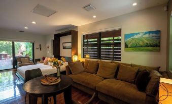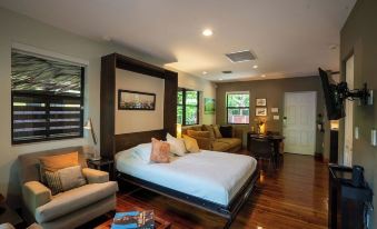 This thoughtfully curated one-bedroom oasis offers an immersive tropical experience surrounded by greenery, Costa Rican hardwood floors, and the peaceful calls of wild peacocks who roam and are fed daily on the property.