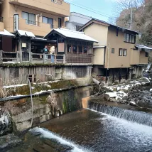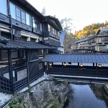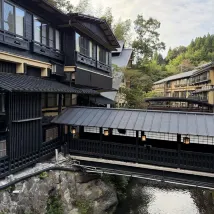Very nice traditional onsen ryokan in the centre of Kurokawa onsen with river in front of rooms.