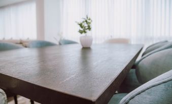 The living room features a SmartTV, the dining area is spacious, and natural light floods the space. Down the hallway, you’ll find the bedrooms, along with an additional Wi-Fi router to ensure a strong and stable connection. Beyond the fully equipped kitchen which includes a refrigerator, microwave, coffee maker, rice cooker, and more you’ll find an extra room.