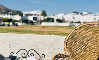 On the upper floor there are three double bedrooms. The master bedroom has two large beds of 105x200 cm, a terrace overlooking the town of Mojácar, a balcony and a large and complete bathroom en suite. There are two other bedrooms in the same room, one with double bed 160x200 cm and another with two large beds 105x200 cm, both with balconies overlooking the beautiful garden and the sea. On the upper floor there is another large bathroom.