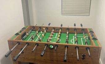 Two of the bedrooms have queen beds. Of those two, one has a tv and desk while the other is secluded in the back for quite and comfort. A larger room has two bunk beds with 5 sleeping areas (1-full and 4-twin) and a tv. The fourth room has a twin daybed that can pull out to a king and a foosball table and tv.