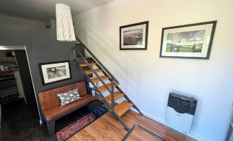 The living area features a 2 seater leather chair, small coffee table, kitchen island with 2 stools for dining or working.