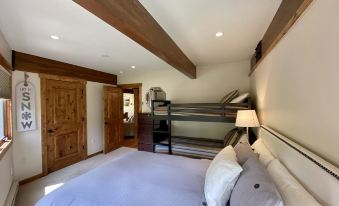 The second bedroom includes stunning Mountain/Resort Views and sleeps 4 with a twin bunk bed and a queen bed with wool carpet throughout. There is plenty of storage and closet space in the room as well and the second full bathroom is immediately next to this bedroom. The second bathroom does include a tub and large vanity.