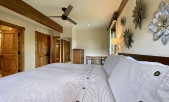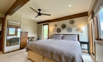 The Master bedroom includes a king-sized bed, wool carpet, workspace, extensive closet space, and a private entrance leading to the wrap-around deck. The ensuite bathroom features a gorgeous standing shower, double vanity, and private water closet!