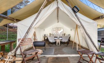 First, shout out to Grace who helped us with our stuff the morning of check-out! We couldn’t find anyone in the lobby tent, and no one was responding to our texts the morning of check out. Grace happened to drive by with a cart and stopped to help us, including carrying some of our bags to the cart. Thanks Grace! This place looks lovely and allowed us to experience the fun of camping without the difficulty. We enjoyed the crafting offered on Tuesday night, as well as the s’mores and board games. There is a short hiking trail nearby, and a deck with a good view of Mount Rushmore attached to the lobby tent. At check in, we were shown where to park and then someone with a golf cart helped bring our bags to the tent. The food and drinks were good, but expensive (except for the tea/coffee/hot chocolate, which is included). The tent itself was lovely. We used the stove (with some help from the staff) but we let the fire go out fairly quickly as it got pretty warm. We had a private toilet and shower, but be warned that there is no real door to either - just a half wall! For a tent, the shower had great water pressure and temperature. It is expensive! My friend and I were a little disappointed when we could only book a tent with one king bed, as no tents were offered that contained two queens / fulls / even twins. At the price we paid, I was also a little disappointed that check out felt so strange, no one around to help or clarify what we needed to do to officially check out.