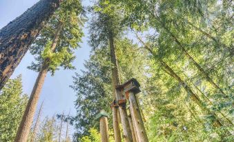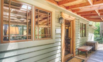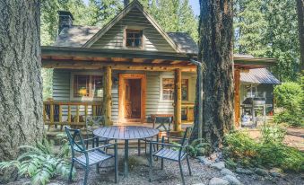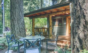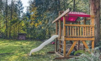 Grill on the gas BBQ year-round under the covered front porch. Listen to the soothing water feature and pond in the front yard, while you dine alfresco at the outdoor dining table. Kids will have fun in the play structure and running around the large lawn in the backyard. You can warm up around the 3-season firepit, too. The Wallace Cottage is close to Wildwood Recreation Site, Sandy Ridge Mountain Bike Trails and Mt Hood National Forest hiking trails. The Wallace Cottage is next door to the Bridlewood Cabin for 2 families or couples traveling together.