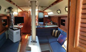 The front bedroom features a custom queen sized mattress v-berth while the other bed is more like a single or small double. There's a kitchen and main lounge area. It comes with a fridge and stove for your use. There's a full bath onboard, but it's the typical boat shower. There's a bath-house in the marina if you're more comfortable showering there or using it's toilets for non-number ones! We've stocked it with bedding and sheets, basic utensils, coffee, and a few sodas to help make you stay more enjoyable.