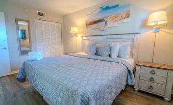 As you step into the condo, you'll find the inviting bedroom to your left. Here, a king-sized bed awaits, offering a restful retreat for two. The room also includes a dresser for convenient storage, making it easy to pack and unpack. Two nightstands with lamps and a wall-mounted flat-screen TV add extra comfort and convenience. Plus, guests staying in this room will have access to their own private closet for all your essentials.