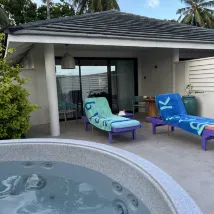1 villa with a jacuzzi (villa number 302) - extremely private, access to the beach is 5 steps away, the entrance to the sea is smooth, and the water is very clear, no corrals, you can go in without slippers. Inside the villa is cozy and clean (they clean it twice), everything is new, I especially liked the outdoor shower and my own terrace, where in the evening you can take a warm bath with a jacuzzi, it's relaxing, super! Lie down and watch the starry sky!