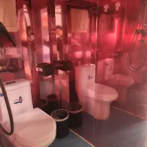 2. The entrance to the room and the bathroom were wet, and it felt like they had not been cleaned at all. Three walls of the bathroom were mirrors, and one was the door, all covered in water stains.