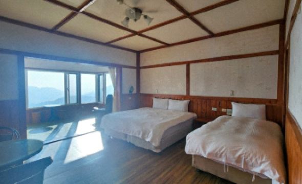 This place is beautiful! Our room offers a lovely garden view, and the restaurant provides a stunning view of the mountain lake. There is an open common balcony with chairs and tables, along with a hot and cold water dispenser for guests to enjoy. While there is no air conditioning in the room, Nantou County's cooler mountain climate makes it comfortable. The bed is equipped with an electric warmer to ensure our comfort.