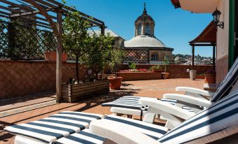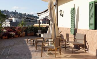 Terrace and Views: A spacious rooftop terrace offers panoramic views of Mount Vesuvius, Capri Island, Naples' cityscape, and the sea. The terrace is described as a highlight, providing a peaceful retreat with seating and stunning sunset vistas, accessible at any time.