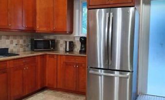 Fully-equipped kitchen, including stainless steel appliances, coffee maker, kettle, and microwave to name a few