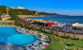 Budget and standard rooms are available for accommodation. Guests can also book Premium Chalets. The rooms are decorated in a classic style and equipped with air conditioning. They are equipped with a TV, a refrigerator, and a private bathroom. Some rooms have a sea view.