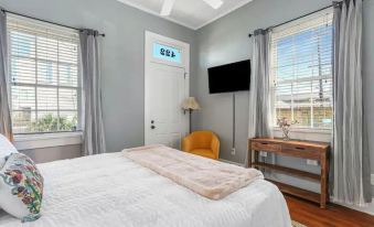 You'll love this fun, comfortable space! The house has two bedrooms. The primary bedroom has a brand new king sized bed with hybrid mattress and brand new comfy linens and pillows. It has a large, walk-in closet and a luxury bathroom, bathtub with shower, and larger sized vanity. There is a Smart TV with remote and access to the back deck.