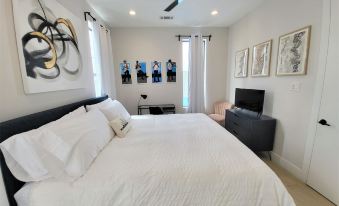 You'll love this fun, comfortable space! The cottage has two bedrooms. The master bedroom has a queen sized bed with memory foam mattress and brand new comfy linens and pillows. It has a large, walk-in closet and a luxury bathroom, modern shower, and double vanity. There is a Roku TV with remote and a desk/chair as well.