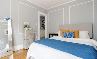 This cozy 2 bedroom apartment accommodates only up to 4 guests. To get to the apartment, you will need to walk up 2 flights of stairs. Each bedroom has a Queen size bed laid with pristine white sheets. The living room has a sofa, two arm chairs and a TV for your enjoyment. Our kitchenette is equipped with a microwave, kettle, toaster, French coffee press and portable cooktop. In the bathroom there is a charming claw foot bathtub with shower head. We offer free driveway parking for one car, plus free street parking as long as you are mindful of the street signs.