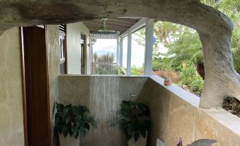 The villa is surrounded on all four sides with beautiful Trinidadian teak decked verandahs. The west verandah is 14’ deep by 72’ long with dining table, sofa, chairs and chaise longue. Watching the sunset from this elevation of 270’ is amazing, especially when you are treated with the famous ‘green flash’. You will also find that the elevation deters the mosquitoes that are usually found at sea level.