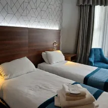 Booked a Carlton double in the annexe, as preferred the blue theme decor, but was allocated a double in the main hotel upon arrival. The wood theme decor, coupled with the small window, made the room quite dark. It was a bit dated, but had everything we needed, including a mini fridge. Bathroom was compact, but it was fine and the shower was really good, however the water pressure was low at times.