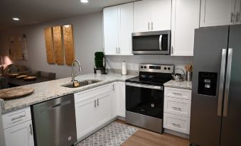 Enter a light filled open floor plan featuring a living/dining combo. Rear bedroom has ensuite bath w/ shower and two large closets. This newy renovated home includes luxury vinyl flooring throughout, new paint, new baths, new kitchen with stainless appliance package and granite counters. smart TV, SONOS sound and internet. New washer and dryer. Plenty of parking and close to major areas! Monthly cleaning is included. Come have a charming stay!About pets:Pets allowed: less than 50 lbs per pet (limit one pet total).About checkOut:Check out before 11:00 AM.About children:Children allowed: ages 0-17.About checkIn:Check in after 3:00 PM.About smoking:Smoking is not permitted.About minBookingAge:Minimum age to rent: 21.About events:No events allowed.