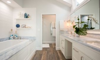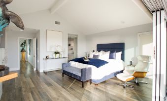 The oceanfront master suite has a king bed and a patio with seating to enjoy the fabulous views up and down the coast! A private desk is set up to keep you connected. The extra-large master bath has double sinks, a tub and a shower.