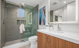 The beautiful master bedroom has a king bed with stunning ocean front views and a luxurious en suite bathroom with a walk in shower and closet. The second bedroom has a queen bed and the third bedroom has 2 twin beds, these room share a jack & jill bathroom with a walk in shower as well. The fourth bedroom has 2 twins and an en suite bathroom with a walk in shower. The fifth bedroom is located on the rooftop deck are with 2 twin beds, it's own bathroom & private balcony. There is also one more bedroom located on the first floor with an en suite bathroom that is also accessible through the main floor.