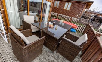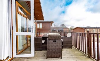 Large outdoor decked area enclosed by balustrades, with a table plus six chairs and four stools, ideal for outdoor eating and conveniently connected to the lodge via French doors