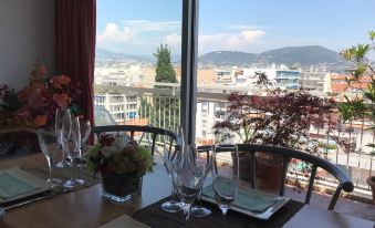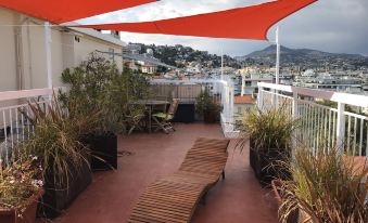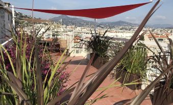 Loft located on the top floor with elevator, a 20 Mq terrace and a private roof terrace as well as a 45 Mq balcony with 360 ° views of the city, mountain and sea. 100 meters from the Promenade des Anglais and private and public beaches. Close to all shops and the center. Direct access from the airport by tram or bus whose stops are less than 100 meters from the apartment.