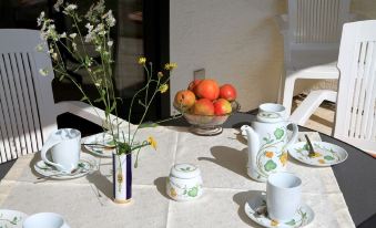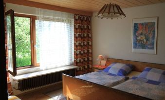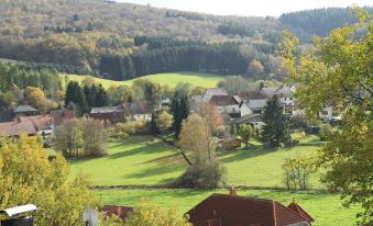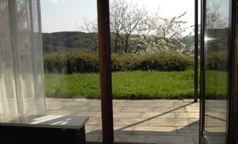 It is best to park your car on the street in front of the house (which is only traffic-restricted for residents). The house itself faces south and gives a clear view of the terrace in front of the living room and the small meadow that still belongs to the terrace, across the Bosbach surrounded by meadows and the row of villages beyond to the forested hills opposite. If you bring your dog (or dogs) with you, the meadow offers itself as a run.
