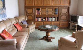 Our tenants are thrilled by the spacious living room, which has a comfortable sofa in front of a panoramic window, consisting of 3 glass elements reaching down to the floor, then the TV corner and a marble coffee table that invites you to coffee and cake.