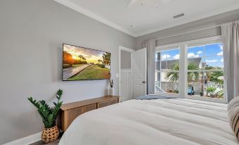 As you step inside, you'll be greeted by the contemporary design and coastal-inspired decor that sets the tone for your beach escape. The living area is an inviting space where you can unwind after a day of sun and sand, complete with plush seating and a large flat-screen TV for entertainment.