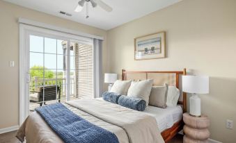 Queen Bedroom: Cozy up in the Queen bed, complete with a TV, dresser, closet, and sliding door access to the deck with seating and views.