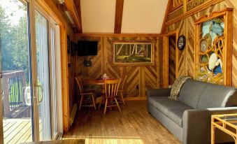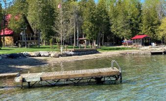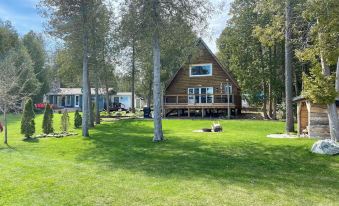 Take it easy at this unique and tranquil getaway. Located on a beautifully landscaped 1 acre lot at the end of the road, this tiny home style cottage is perfect for families and friends. You will have access to a private beach, plenty of dockage, kayaks, your own fire pits and BBQ, several outdoor patio/lounging areas, satellite tv, wifi, and of course the great view of lake. You will be staying in a custom build Aframe Cottage. This cottage was featured in Cottage living Magazine in the 1990’s. Drive right up to the cottage and enter through an oversized patio door that provides a stunning view of the lake. Once you enter you will see the kitchenette, dining and living room, full bathroom, and 2 bedrooms on the main floor. There is a custom built spiral staircase that leads to the third bedroom loft which is open concept. The oversized patio doors lead to your own private deck that over looks your own yard space, BBQ, and fire pit area. This is not a shared space, it is all yours! Other space’s include a gazebo with patio down by the beach, large decks overlooking the lake, a couple docks in a protected harbour and a large manicured lawn with a beautifully landscaped yard. Located at the end of the road, you will find your little slice of heaven with almost all the amenities nearbyAbout pets:No pets allowed.About checkOut:Check out before 10:00 AM.About children:Children allowed: ages 0-17.Message host regarding pet policy.About checkIn:Check in after 2:00 PM.About smoking:Smoking is not permitted.About minBookingAge:Minimum age to rent: 21.About events:No events allowed.