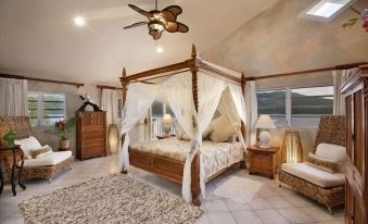 This luxury Estate is the only beachfront property that comfortably accommodates up to 12 guests in 6 king suites, on its grand floor walk-in Main Level. The villa's spacious floor design is truly one of a kind and is separated by two private wings. The Magens Bay Wing includes the Primary Suite, and two other bedrooms, while the Picara Point Wing encompasses the Owners Suite, Junior Suite and one additional bedroom. The Pool and Beach Suite Level (Second Floor), only 12 steps down, offers five (5) expansive King Suites with living and dining areas and collectively, with the main level, can host up to 22 guests. The Spa and Royal Suites, situated on the 3rd and 4th level closest to the lower sun and soak pool and Beach, can accommodate an additional 12 guests. All include air conditioning, full private baths, ultra-king bedding, unique faux finishes, original art, and stylish décor from around the world.