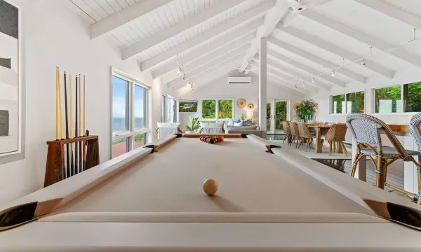 Inside, the villa is a haven of entertainment and relaxation. The spacious living areas are thoughtfully designed with open-plan layouts, perfect for gathering with family and friends. Enjoy a friendly game of pool at the billiards table, or indulge in movie nights in the dedicated theater room, equipped with an 85" TV for an immersive cinematic experience.