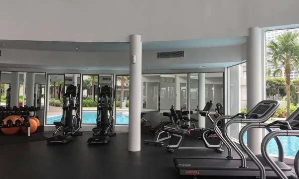 The apartment also offers an outdoor swimming pool and a fitness room for guests to relax in.