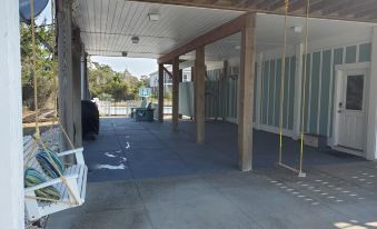 There is a heated outdoor shower along with a sitting area that surrounds a large gas fire pit. Lots of games onsite, including cornhole, a basketball net and less than a mile to the local outdoor sports recreation park, where you will find basketball, pickleball and tennis courts.