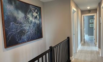 We have plenty of room for friends and family to spread out and be comfortable. The house has 6 total bedrooms—one on the first floor and 5 on the second. The first-floor bedroom has a king bed, as do two primary bedrooms upstairs. In addition there are 2 queen bedrooms, plus a kids’ room that has two queen beds and a Twin XL bunk bed, which rounds out the spacious sleeping accommodations. Additionally, we have an extra fold-out bed.