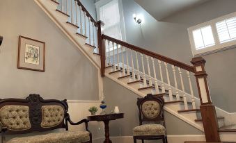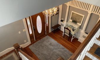 The private entry/foyer features a desk/workspace, and beautiful antique furniture. follow the gorgeous staircase adorned with chandlers to the rest of the suite.