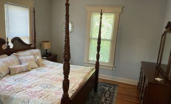 The master bedroom features a king sized poster bed with topper, closet, ceiling fans, sound machine, smart TV, iron and ironing board along with an extra pillows and blanket.