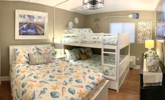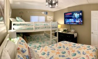 The bedroom has a full over full bunk bed (sleeps 4) and a full bed (sleeps 2), and a large 60” flat-screen television.
