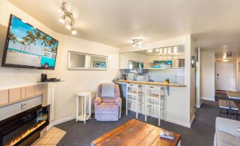 This modest condo sleeps up to four guests comfortably between the bedroom fitted with a queen bed and the sleeper sofa in the living area, which can easily accommodate two guests. With a full kitchen stocked with pots & pans, flatware and dinnerware, you'll have everything you need to cook a hot meal while on vacation. Pull out the dining table to seat four comfortably or dine out on the open deck, overlooking the picnic area and the mighty Pacific Ocean.