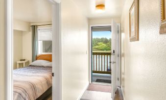 This cozy living area features a large and comfy couch and recliner, a coffee table, flat screen TV and a gas fireplace to set the mood. Relax and take in the view of the Pacific Ocean, the dunes, and the seabirds overhead as your stress of daily life melts away. In good weather, you can adjourn to the private deck and smell the fragrant sea air roll in with the warm breeze.