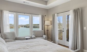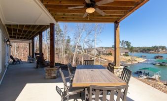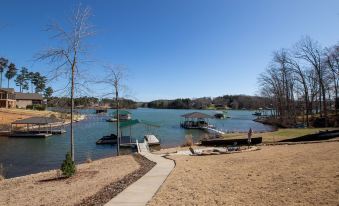 This new home has unobstructed big lake views from every room in the house. It comfortably sleeps 12 people and has just been decorated with new furnishings throughout. There are many spaces to hang out and relax; including a sunroom with couch and dining table, two family rooms, two open air porches and chair around the fire pit. Lake activities include a dock with boat slip, with 1 available jet ski lift, shallow water for wading and playing, deep water for fishing and swimming and 2 kayaks with rental. Take out the kayaks a paddle around the beautiful lake. Put out the floating swim dock and have an extra swim to spot.