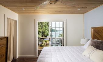 The cabin living room is the perfect place to curl up with a good book or plan for another exciting day on the lake! Watch your favorite movie or show on the TV as you enjoy the ambiance of the surrounding trees, water views and large trifold glass doors.