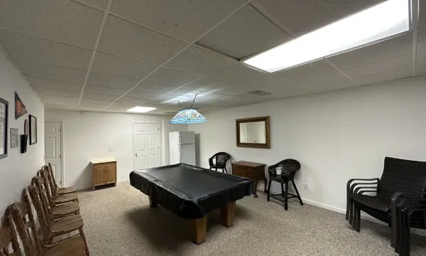 The ground level has a walkout French patio door, with easy access to the boat dock from this level. There is a second outdoor patio space, wonderful for quietly taking in the lovely outdoors. There is one full bath, one half-bath and two separate shower rooms on the lower level with easy access when coming in from the lake. Two additional bedrooms face the lake for more enjoyment. One connects to a full bath and the other sits beside the half bath. A family room and billiard room provide extra room for entertainment and enjoyment, include a pool table, foosball table, chess table, and large smart TV, visible from the billiard table.