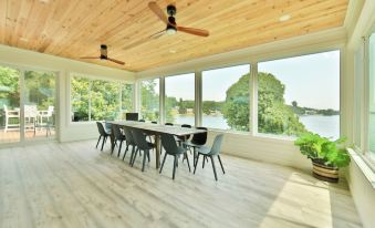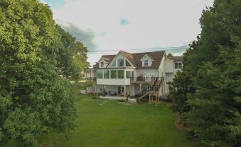 A large covered dock sits in the water, with room for two extra boats to be tied up. The swim deck has eight feet uncovered and four feet covered for both plenty of sun and shade to make everyone happy. The use of the dock is free for our guests. A sunroom and two decks off of the house provide great spaces to relax and enjoy meals. Parking for six-eight cars is available, 1 in the garage, 4 more on main level outside the garage and additional parking behind the house for boat trailers and more.