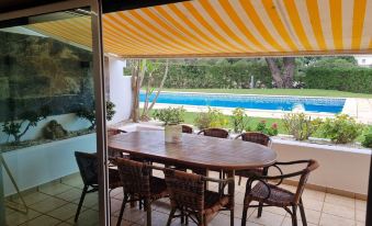 Joint house in a gated community with pool and garden. Prime location next to the pine forest and beach cliff (pedestrian). Quiet and very pleasant area of charming holiday villas, luxurious hotels and pedestrian access to restaurants, bars, mini-market and other shops.