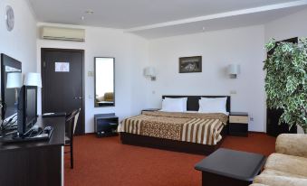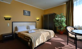80% of the Hotel's guests are business travelers, business tourists, so all the services in the Hotel are focused on them. For comfortable accommodation of guests, the hotel offers 40 spacious and cozy rooms of four categories: Standard, Junior Suite, Suite, Apartment. ATMs, cafes, shopping boutiques, an entertainment center (bowling alley), conference halls, banquet and buffet halls, legal and accounting organizations, beauty salons and much more are available to hotel guests without leaving the complex. Meals at the hotel according to the "Buffet" system.