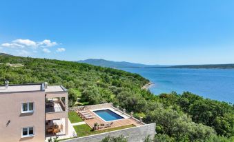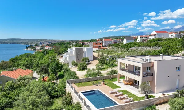 Modern villa "Grota", 2 storeys, built in 2024. 28 km from the centre of Zadare, in a sunny, elevated position, 180 m from the sea, 600 m from the beach, located by a road. Private: property 1'000 m2 (fenced), swimming pool angular (8 x 4 m, depth 150 cm, seasonal availability: 02.May. - 26.Sep.). Garden furniture, barbecue. In the house: internet access, washing machine. Parking (for 3 cars) at the house on the premises. Shop 1 km, restaurant 1.5 km, bus stop 3.2 km, pebble beach 600 m, shingle beach 180 m. Nearby attractions: NP Paklenica 17 km, rafting Zrmanja 35 km. Groups of teenagers on request only. 8-room villa 230 m2 on 2 levels. In 2024, very modern furnishings: large, interconnecting room with satellite TV. Exit to the terrace, to the swimming pool. 1 room with 1 french bed (160 cm, length 200 cm), satellite TV. Exit to the garden. 1 room with 1 sofabed (90 cm, length 200 cm). Shower/WC, sep. WC. Upper floor: 2 rooms, each room with 1 french bed (180 cm, length 200 cm), satellite TV. Exit to the balcony. 1 room with 2 beds (90 cm, length 200 cm), air conditioning. Exit to the balcony. Open kitchen (oven, dishwasher, 4 induction hot plates, kettle, freezer) with air conditioning. Exit to the terrace. 2 showers/WC. Floor heating. Heating available only from 01.10. to 01.05. Terrace 24 m2, roofed terrace 24 m2, roofed. Terrace furniture, deck chairs. Panoramic view of the sea. Facilities: iron, hair dryer. Internet (WiFi, free). Please note: suitable for families. Non-smoking house. Fire extinguisher.